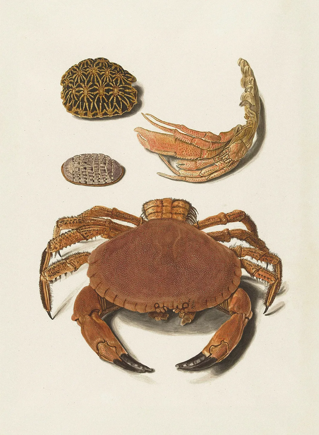 Een krab, een schaar van een krab en twee schilden van schildpadden