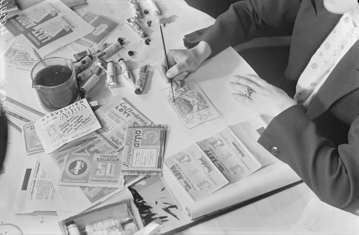 Title: Arpajaisyhdistys ry:n työntekijä suunnittelemassa aseveliarpoja